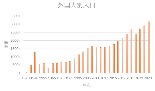 2023年の日本に在留する外国人数は1920年の30倍となっている通り、外国人総務省統計局による調査によると毎年移民の数は増え続けていることが分かります。
