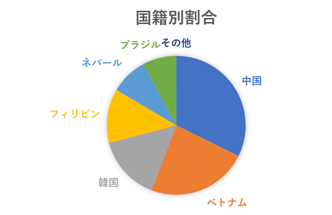 中国籍が約78万人で全体の約23%を占め、ベトナム籍が約52万人で約15%、韓国籍が約41万人で約12%となっています。特にベトナムからの移民は2015年以降急増しており、技能実習生や留学生として来日する人が多いのが特徴です。フィリピン、ブラジル、ネパール、インドネシアなども主要な出身国として挙げられます。在留外国人の約90%がアジア出身者で占められており、日本の外国人受け入れは地理的に近いアジア諸国が中心となっています。